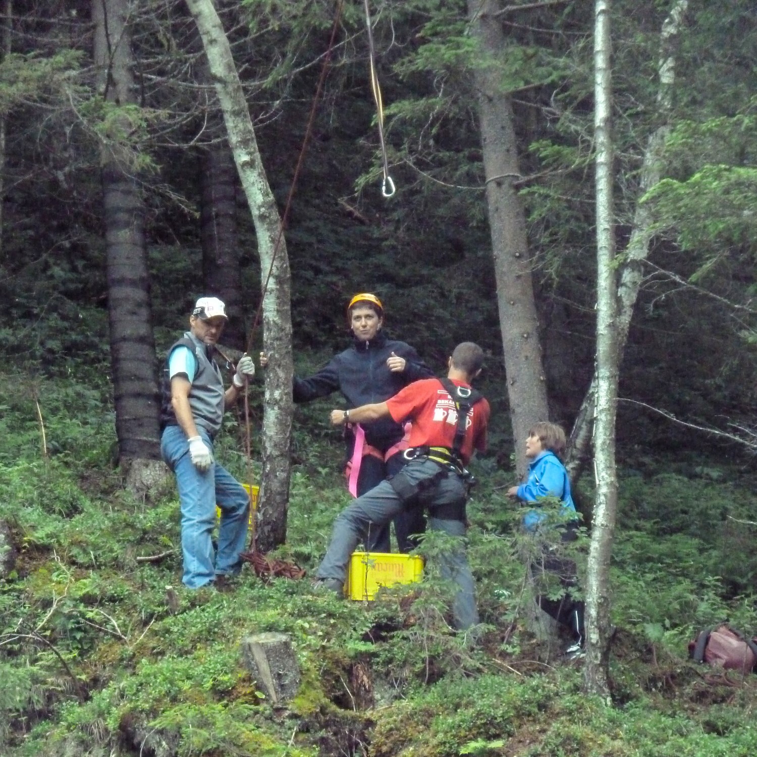 Sr. Maria wird fürs Abseilen vorbereitet. Helm und Klettergurt sitzt!